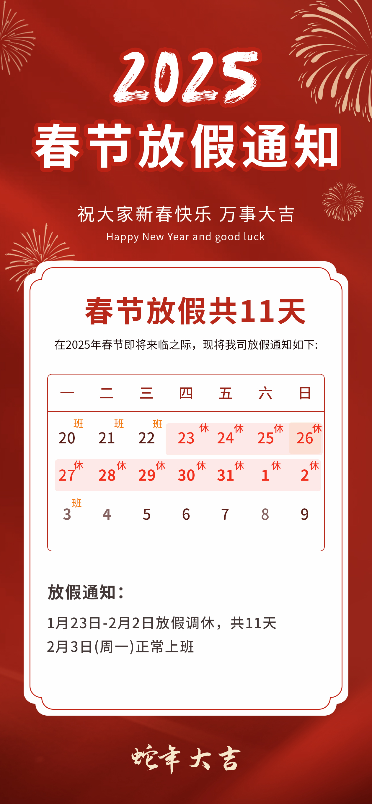 為了讓公司員工過一個歡樂祥和的春節,將對春節假日提前和延長,現將公司春節放假時間通知如下:2025年1月23日(農歷臘月二十四)~2025年2月2日(農歷正月初五)(共計11天),2月3日(農歷正月初六)正式上班。
